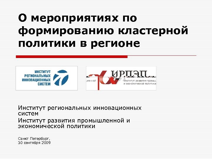 О мероприятиях по формированию кластерной политики в регионе Институт региональных инновационных систем Институт развития промышленной и экономической политики Санкт Петербург, 30 сентября 2009
