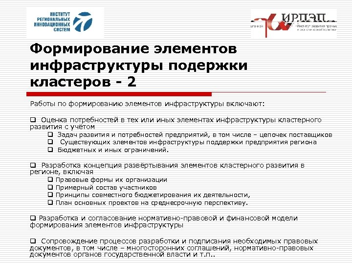Формирование элементов инфраструктуры подержки кластеров - 2 Работы по формированию элементов инфраструктуры включают: q Оценка потребностей в тех или иных элементах инфраструктуры кластерного развития с учётом q Задач развития и потребностей предприятий, в том числе – цепочек поставщиков q Существующих элементов инфраструктуры поддержки предприятия региона q Бюджетных и иных ограничений. q Разработка концепция развёртывания элементов кластерного развития в регионе, включая q q Правовые формы их организации Примерный состав участников Принципы совместного бюджетирования их деятельности, План основных проектов на среднесрочную перспективу. q Разработка и согласование нормативно-правовой и финансовой модели формирования элементов инфраструктуры q Сопровождение процессов разработки и подписания необходимых правовых документов, в том числе – многосторонних соглашений, нормативно-правовых документов органов государственной власти и т. п. .