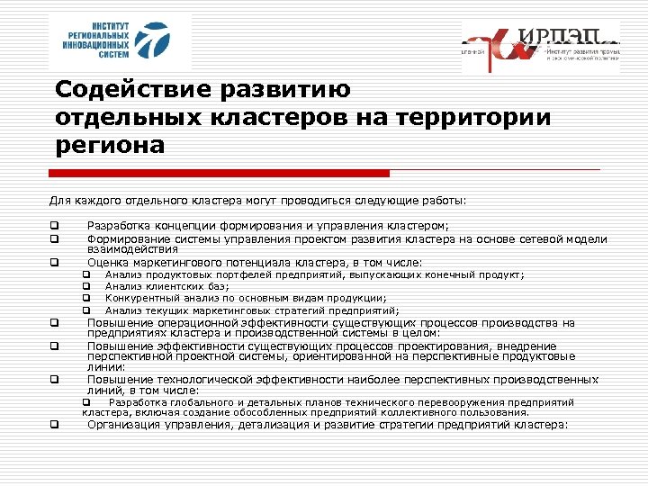 Содействие развитию отдельных кластеров на территории региона Для каждого отдельного кластера могут проводиться следующие работы: q q q Разработка концепции формирования и управления кластером; Формирование системы управления проектом развития кластера на основе сетевой модели взаимодействия Оценка маркетингового потенциала кластера, в том числе: q Анализ продуктовых портфелей предприятий, выпускающих конечный продукт; q Анализ клиентских баз; q Конкурентный анализ по основным видам продукции; q Анализ текущих маркетинговых стратегий предприятий; Повышение операционной эффективности существующих процессов производства на предприятиях кластера и производственной системы в целом: Повышение эффективности существующих процессов проектирования, внедрение перспективной проектной системы, ориентированной на перспективные продуктовые линии: Повышение технологической эффективности наиболее перспективных производственных линий, в том числе: q Разработка глобального и детальных планов технического перевооружения предприятий кластера, включая создание обособленных предприятий коллективного пользования. q Организация управления, детализация и развитие стратегии предприятий кластера: