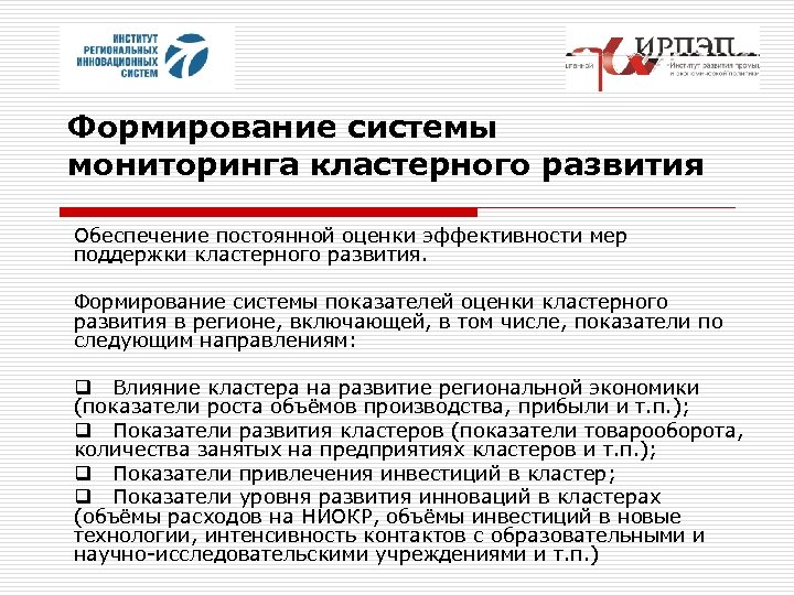 Формирование системы мониторинга кластерного развития Обеспечение постоянной оценки эффективности мер поддержки кластерного развития. Формирование системы показателей оценки кластерного развития в регионе, включающей, в том числе, показатели по следующим направлениям: q Влияние кластера на развитие региональной экономики (показатели роста объёмов производства, прибыли и т. п. ); q Показатели развития кластеров (показатели товарооборота, количества занятых на предприятиях кластеров и т. п. ); q Показатели привлечения инвестиций в кластер; q Показатели уровня развития инноваций в кластерах (объёмы расходов на НИОКР, объёмы инвестиций в новые технологии, интенсивность контактов с образовательными и научно-исследовательскими учреждениями и т. п. )