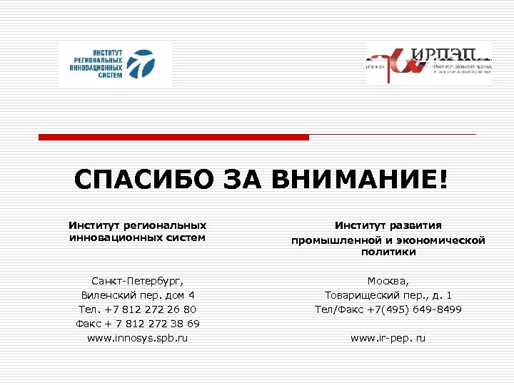СПАСИБО ЗА ВНИМАНИЕ! Институт региональных инновационных систем Институт развития промышленной и экономической политики Санкт-Петербург, Виленский пер. дом 4 Тел. +7 812 272 26 80 Факс + 7 812 272 38 69 www. innosys. spb. ru Москва, Товарищеский пер. , д. 1 Тел/Факс +7(495) 649 -8499 www. ir-pep. ru
