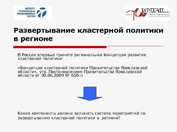Развертывание кластерной политики в регионе В России впервые принята региональная Концепция развития кластерной политики: «Концепция кластерной политики Правительства Ярославской области» , утв. Постановлением Правительства Ярославской области от 30. 06. 2009 № 650 -п Какие компоненты должна включать система мероприятий по развертыванию кластерной политики в регионе?