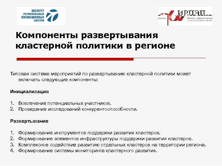 Компоненты развертывания кластерной политики в регионе Типовая система мероприятий по развертыванию кластерной политики может включать следующие компоненты: Инициализация 1. Вовлечение потенциальных участников. 2. Проведение исследований конкурентоспособности. Развертывание 1. 2. 3. 4. Формирование инструментов поддержки развития кластеров. Формирование элементов инфраструктуры поддержки развития кластеров. Комплексное содействие развитию отдельных кластеров на территории региона. Формирование системы мониторинга кластерного развития.