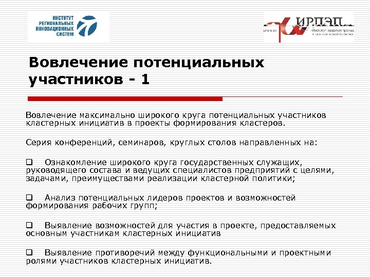 Вовлечение потенциальных участников - 1 Вовлечение максимально широкого круга потенциальных участников кластерных инициатив в проекты формирования кластеров. Серия конференций, семинаров, круглых столов направленных на: q Ознакомление широкого круга государственных служащих, руководящего состава и ведущих специалистов предприятий с целями, задачами, преимуществами реализации кластерной политики; q Анализ потенциальных лидеров проектов и возможностей формирования рабочих групп; q Выявление возможностей для участия в проекте, предоставляемых основным участникам кластерных инициатив q Выявление противоречий между функциональными и проектными ролями участников кластерных инициатив.