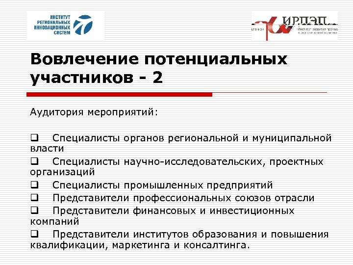 Вовлечение потенциальных участников - 2 Аудитория мероприятий: q Специалисты органов региональной и муниципальной власти q Специалисты научно-исследовательских, проектных организаций q Специалисты промышленных предприятий q Представители профессиональных союзов отрасли q Представители финансовых и инвестиционных компаний q Представители институтов образования и повышения квалификации, маркетинга и консалтинга.