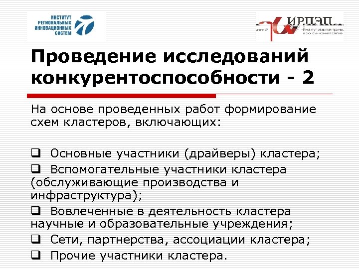 Проведение исследований конкурентоспособности - 2 На основе проведенных работ формирование схем кластеров, включающих: q Основные участники (драйверы) кластера; q Вспомогательные участники кластера (обслуживающие производства и инфраструктура); q Вовлеченные в деятельность кластера научные и образовательные учреждения; q Сети, партнерства, ассоциации кластера; q Прочие участники кластера.