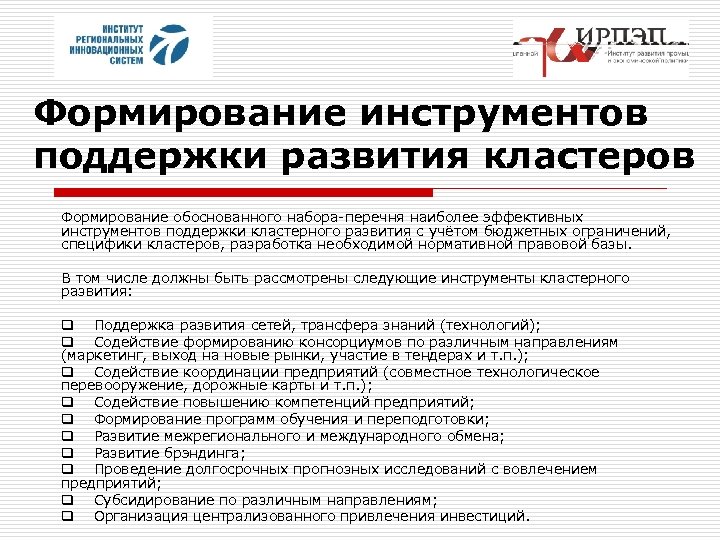 Формирование инструментов поддержки развития кластеров Формирование обоснованного набора-перечня наиболее эффективных инструментов поддержки кластерного развития с учётом бюджетных ограничений, специфики кластеров, разработка необходимой нормативной правовой базы. В том числе должны быть рассмотрены следующие инструменты кластерного развития: q Поддержка развития сетей, трансфера знаний (технологий); q Содействие формированию консорциумов по различным направлениям (маркетинг, выход на новые рынки, участие в тендерах и т. п. ); q Содействие координации предприятий (совместное технологическое перевооружение, дорожные карты и т. п. ); q Содействие повышению компетенций предприятий; q Формирование программ обучения и переподготовки; q Развитие межрегионального и международного обмена; q Развитие брэндинга; q Проведение долгосрочных прогнозных исследований с вовлечением предприятий; q Субсидирование по различным направлениям; q Организация централизованного привлечения инвестиций.