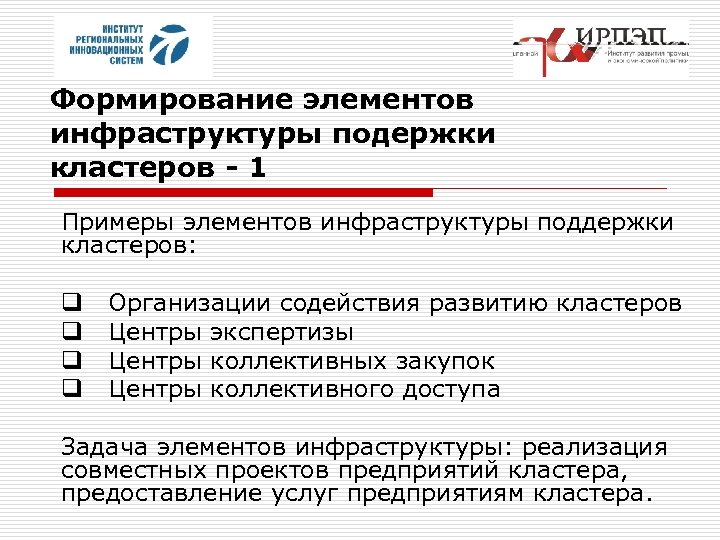 Формирование элементов инфраструктуры подержки кластеров - 1 Примеры элементов инфраструктуры поддержки кластеров: q q Организации содействия развитию кластеров Центры экспертизы Центры коллективных закупок Центры коллективного доступа Задача элементов инфраструктуры: реализация совместных проектов предприятий кластера, предоставление услуг предприятиям кластера.