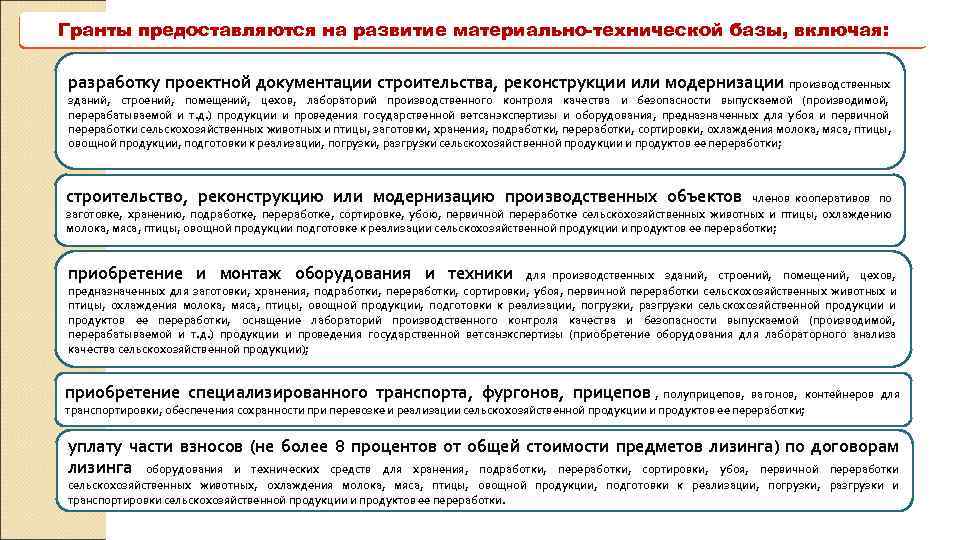 Гранты предоставляются на развитие материально-технической базы, включая: Поддержка развития сельскохозяйственной потребительской кооперации разработку проектной документации строительства, реконструкции или модернизации производственных зданий, строений, помещений, цехов, лабораторий производственного контроля качества и безопасности выпускаемой (производимой, перерабатываемой и т. д. ) продукции и проведения государственной ветсанэкспертизы и оборудования, предназначенных для убоя и первичной переработки сельскохозяйственных животных и птицы, заготовки, хранения, подработки, переработки, сортировки, охлаждения молока, мяса, птицы, овощной продукции, подготовки к реализации, погрузки, разгрузки сельскохозяйственной продукции и продуктов ее переработки; строительство, реконструкцию или модернизацию производственных объектов членов кооперативов по заготовке, хранению, подработке, переработке, сортировке, убою, первичной переработке сельскохозяйственных животных и птицы, охлаждению молока, мяса, птицы, овощной продукции подготовке к реализации сельскохозяйственной продукции и продуктов ее переработки; приобретение и монтаж оборудования и техники для производственных зданий, строений, помещений, цехов, предназначенных для заготовки, хранения, подработки, переработки, сортировки, убоя, первичной переработки сельскохозяйственных животных и птицы, охлаждения молока, мяса, птицы, овощной продукции, подготовки к реализации, погрузки, разгрузки сельскохозяйственной продукции и продуктов ее переработки, оснащение лабораторий производственного контроля качества и безопасности выпускаемой (производимой, перерабатываемой и т. д. ) продукции и проведения государственной ветсанэкспертизы (приобретение оборудования для лабораторного анализа качества сельскохозяйственной продукции); приобретение специализированного транспорта, фургонов, прицепов , полуприцепов, вагонов, контейнеров для транспортировки, обеспечения сохранности при перевозке и реализации сельскохозяйственной продукции и продуктов ее переработки; уплату части взносов (не более 8 процентов от общей стоимости предметов лизинга) по договорам лизинга оборудования и технических средств для хранения, подработки, переработки, сортировки, убоя, первичной переработки сельскохозяйственных животных, охлаждения молока, мяса, птицы, овощной продукции, подготовки к реализации, погрузки, разгрузки и транспортировки сельскохозяйственной продукции и продуктов ее переработки.