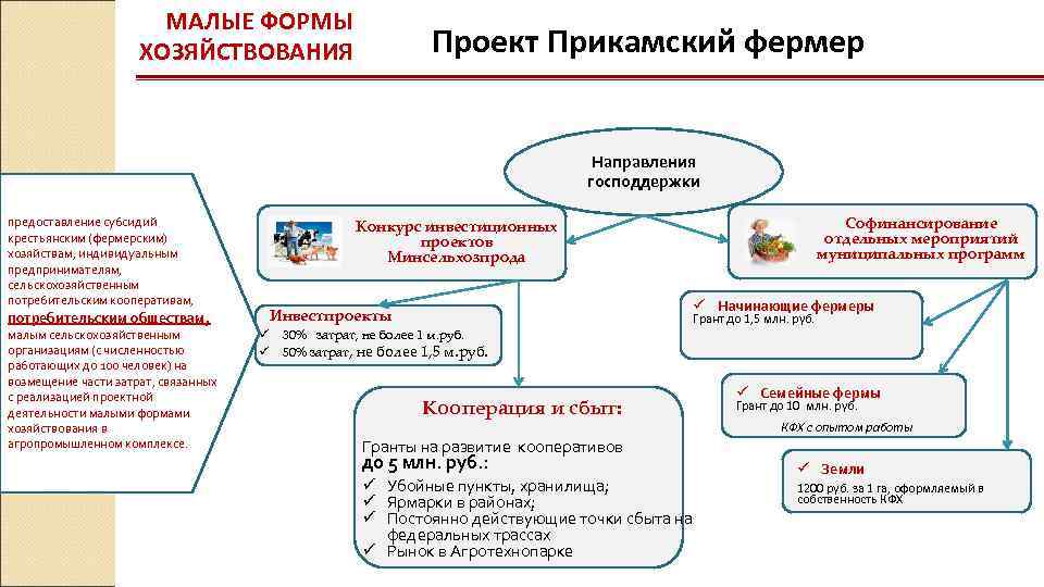 МАЛЫЕ ФОРМЫ ХОЗЯЙСТВОВАНИЯ Проект Прикамский фермер Направления господдержки предоставление субсидий Конкурс инвестиционных Софинансирование крестьянским (фермерским) проектов отдельных мероприятий хозяйствам, индивидуальным Минсельхозпрода муниципальных программ предпринимателям, сельскохозяйственным потребительским кооперативам, ü Начинающие фермеры потребительским обществам, Инвестпроекты Грант до 1, 5 млн. руб. малым сельскохозяйственным ü 30% затрат, не более 1 м. руб. организациям (с численностью ü 50% затрат, не более 1, 5 м. руб. работающих до 100 человек) на возмещение части затрат, связанных с реализацией проектной ü Семейные фермы деятельности малыми формами Кооперация и сбыт: Грант до 10 млн. руб. хозяйствования в КФХ с опытом работы агропромышленном комплексе. Гранты на развитие кооперативов до 5 млн. руб. : ü Земли ü Убойные пункты, хранилища; 1200 руб. за 1 га, оформляемый в ü Ярмарки в районах; собственность КФХ ü Постоянно действующие точки сбыта на федеральных трассах ü Рынок в Агротехнопарке