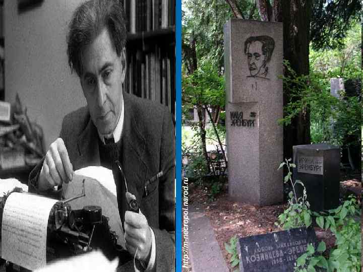 Ø В конце 1950 -х годов Эренбург начал работу над книгой мемуаров «Люди. Годы. Жизнь» . Изданная в 1960 -е годы, она включала шесть частей; седьмая часть (незаконченная) была опубликована только в 1987 году. В книге описано значительное число событий первой половины XX века, даны литературные портреты многих выдающихся личностей: ученых (А. Эйнштейн, Ф. Жолио-Кюри), русских писателей и поэтов (И. Э. Бабель, К. Д. Бальмонт, А. Белый, В. Я. Брюсов, М. А. Волошин, В. С. Гроссман, С. П. Гудзенко, С. А. Есенин, М. Е. Кольцов, О. Э. Мандельштам, В. В. Маяковский, Б. Л. Пастернак, А. М. Ремизов, А. Н. Толстой, Ю. Н. Тынянов, А. А. Фадеев, М. И. Цветаева), зарубежных писателей и поэтов (Г. Аполлинер, Ж. Р. Блок, Р. Деснос, А. Жид, М. Залка, П. Истрати, А. Мачадо-и-Руис, В. Незвал, П. Неруда, Й. Рот, Э. Толлер, Ю. Тувим, Э. Хемингуэй, Н. Хикмет, П. Элюар), художников (П. П. Кончаловский, Р. Р. Фальк, Ф. Леже, А. Марке, А. Матисс, А. Модильяни, П. Пикассо, Д. Ривера), режиссеров (В. Л. Дуров, В. Э. Мейерхольд, А. Я. Таиров), советских дипломатов (А. М. Коллонтай, М. М. Литвинов, Я. З. Суриц, К. А. Уманский), французских политиков (И. Фарж, Э. Эррио) и др. Публикация мемуаров проходила в тяжелой борьбе с редакторами и цензорами. Эренбург не отрицал, что его книга субъективна и отстаивал свое право на субъективные оценки людей и событий. Он описывал в том числе и те события, и тех людей, которых в советской печати того времени было не принято упоминать. Мемуары подвергались острой критике с двух сторон – как представителями консервативных сил, так и теми, кто надеялся увидеть в них «всю правду» . Эренбург признавал, что пишет «не всю правду» , но оправдывался тем, что хотя бы часть правды немедленно узнают миллионы людей. И действительно, его мемуары сыграли важную роль в становлении мировоззрения «шестидесятников» . Ø Умер Эренбург 31 августа 1967 года в Москве. Похоронен на Новодевичьем кладбище. Ø