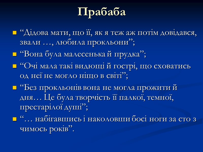 Прабаба “Дідова мати, що її, як я теж аж потім довідався, звали …, любила прокльони”; “Вона була малесенька й прудка”; “Очі мала такі видющі й гострі, що сховатись од неї не могло ніщо в світі”; “Без прокльонів вона не могла прожити й дня… Це була творчість її палкої, темної, престарілої душі”; “… набігавшись і наколовши босі ноги за сто з чимось років”.