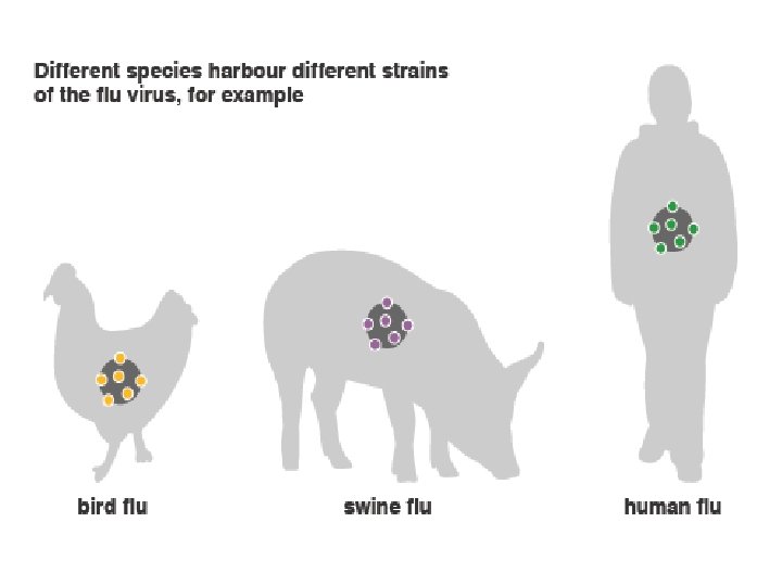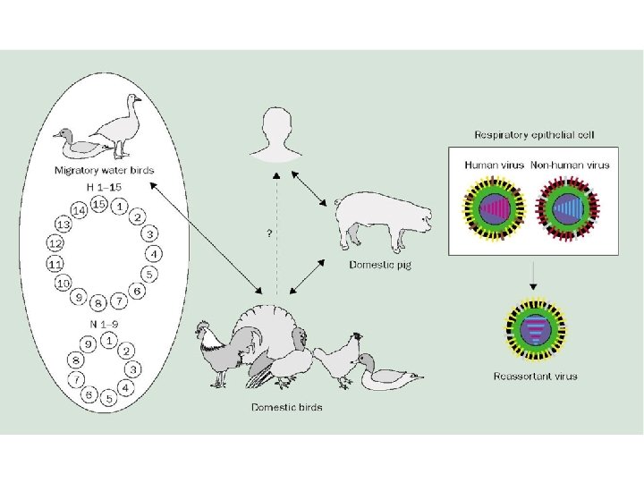• Subtipovi avian influence A virus (H 5 N 1, H 9 N 2, H 7 N 7 subtip) se prvenstveno pripajaju na receptor sijalične kiseline Alfa-2 -3 koji je prisutan u respiratornom i alimentarnom epitelu ptica (pa se izlučuje fecesom) ali takodje i na ljudskoj konjunktivi i cilijarnom epitelu respiratornog trakta. • Ovo može da delimično objasni zašto avian virusi mogu da predju barijeru vrste i uzrokuju i infekciju čoveka. • Cilije respiratornog epitela ljudi u zadnjoj fazi infekcije dozvoljavaju i ljudskom i avian virusu infekciju (koinfekcija). • Respiratorni epitel svinja sadrži i jedan i drugi receptor sijalične kiseline.
