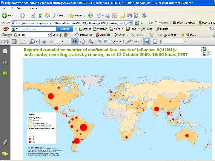 Све земље, чланице ЕУ и ЕФТА, пријавиле су случајеве обољевања од грипа А(Х 1 Н 1), па је укупан број потврђених случајева новог грипа, од априла 2009. године, 58. 934, укључујући 204 смртна исхода. Највећи број случајева регистрован и потврђен лабораторијски је у Немачкој и Великој Британији. ( ECDC Daily Update, 13. october 2009. godine) Укупан број оболелих у свету, са 2. октобром 2009. године до 16 часова је 378 223, укључујући 4 495 смртних исхода. (Communicable Disease Threats Report, 12. october 2009. )