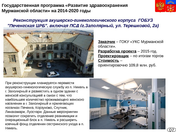07 Государственная программа «Развитие здравоохранения Мурманской области» на 2014 -2020 годы Реконструкция акушерско-гинекологического корпуса ГОБУЗ «Печенгская ЦРБ», включая ПСД (г. Заполярный, ул. Терешковой, 2 а) Заказчик – ГОКУ «УКС Мурманской области» . Разработка проекта – 2015 год. Проектировщик – по итогам торгов Стоимость – ориентировочно 109, 8 млн. руб. При реконструкции планируется перевести акушерско-гинекологическую службу из п. Никель в г. Заполярный и разместить в одном здании с женской консультацией в связи с тем, что наибольшее количество проживающего женского населения в г. Заполярный и прилегающих поселках Печенга, Корзуново, Спутник, Линахамари, Луостари. Данные мероприятия позволят сократить отделение реанимации и операционный блок в п. Никель и расширить коечный фонд отделения сестринского ухода в п. Никель.