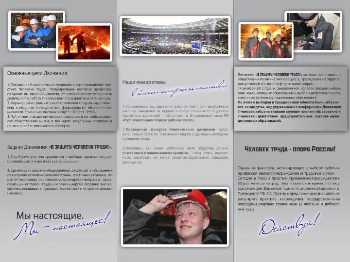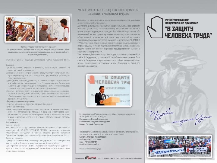 III Молодежный слет работающей молодёжи Урала «Тургояк-2013» Флэшмоб совместно с общественной организацией «Славим человека труда» , направленный на популяризацию рабочих профессий, эта и другие проекты обсуждались всеми с интересом и участием. Мозговой штурм, политические и коммуникативные бои, походы – Всё это позволяет сформировать команду лидеров работающей молодёжи