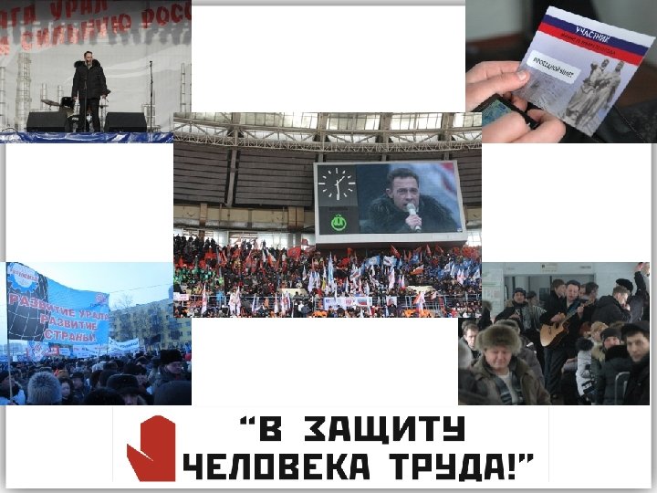 МОД «В ЗАЩИТУ ЧЕЛОВЕКА ТРУДА» Хроника событий: январь 2012 – инициативные группы работников организовали встречи в трудовых коллективах 25 01 2012 – митинг на площади у ж/д вокзала Екатеринбурга (12 000 участников) 23 02 2012 – спецпоезд уральских рабочих в Москву, стадион «Лужники»