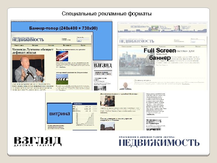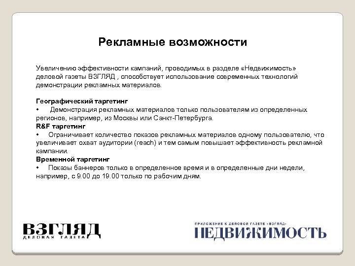 Рекламные возможности Увеличению эффективности кампаний, проводимых в разделе «Недвижимость» деловой газеты ВЗГЛЯД , способствует использование современных технологий демонстрации рекламных материалов. Географический таргетинг • Демонстрация рекламных материалов только пользователям из определенных регионов, например, из Москвы или Санкт-Петербурга. R&F таргетинг • Ограничивает количество показов рекламных материалов одному пользователю, что увеличивает охват аудитории (reach) и тем самым повышает эффективность рекламной кампании. Временной таргетинг • Показы баннеров только в определенное время и в определенные дни недели, например, с 9. 00 до 19. 00 только по рабочим дням.