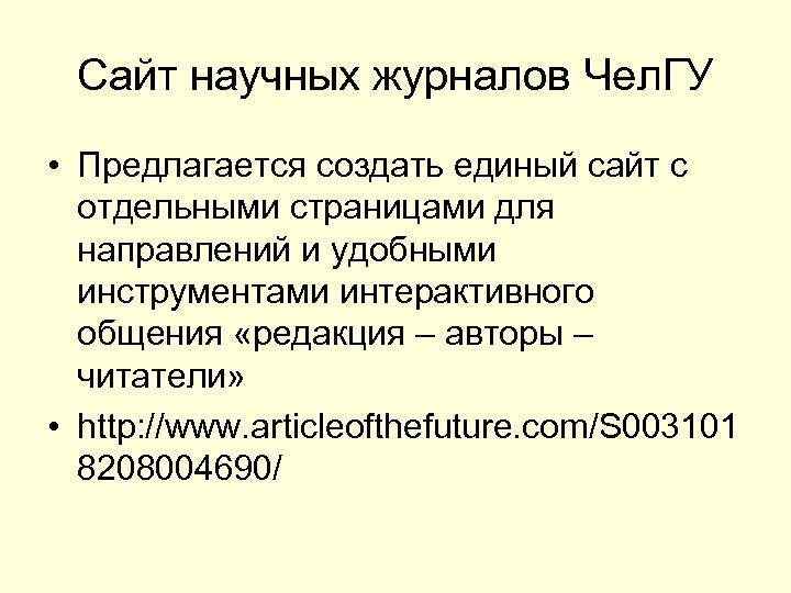 Сайт научных журналов Чел. ГУ • Предлагается создать единый сайт с отдельными страницами для направлений и удобными инструментами интерактивного общения «редакция – авторы – читатели» • http: //www. articleofthefuture. com/S 003101 8208004690/