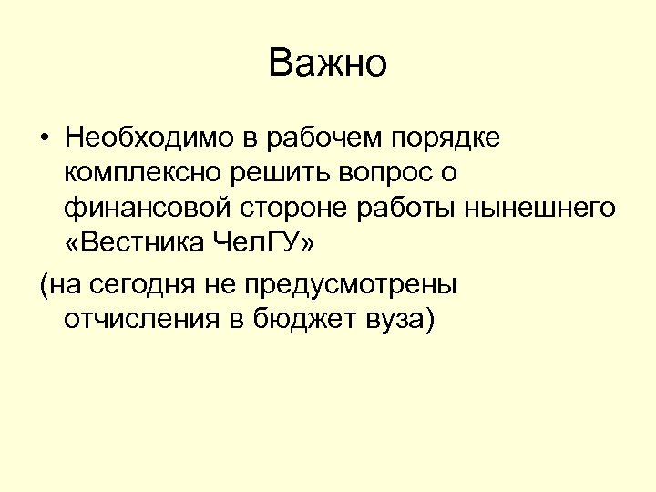 Важно • Необходимо в рабочем порядке комплексно решить вопрос о финансовой стороне работы нынешнего «Вестника Чел. ГУ» (на сегодня не предусмотрены отчисления в бюджет вуза)