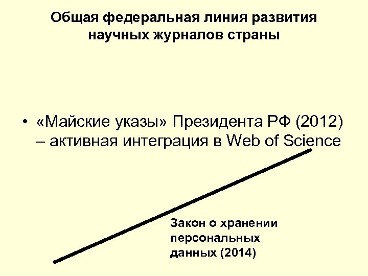 Общая федеральная линия развития научных журналов страны • «Майские указы» Президента РФ (2012) – активная интеграция в Web of Science Закон о хранении персональных данных (2014)