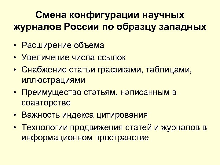 Смена конфигурации научных журналов России по образцу западных • Расширение объема • Увеличение числа ссылок • Снабжение статьи графиками, таблицами, иллюстрациями • Преимущество статьям, написанным в соавторстве • Важность индекса цитирования • Технологии продвижения статей и журналов в информационном пространстве