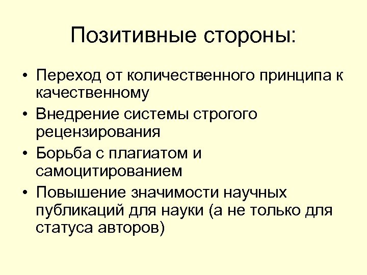 Позитивные стороны: • Переход от количественного принципа к качественному • Внедрение системы строгого рецензирования • Борьба с плагиатом и самоцитированием • Повышение значимости научных публикаций для науки (а не только для статуса авторов)
