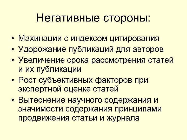 Негативные стороны: • Махинации с индексом цитирования • Удорожание публикаций для авторов • Увеличение срока рассмотрения статей и их публикации • Рост субъективных факторов при экспертной оценке статей • Вытеснение научного содержания и значимости содержания принципами продвижения статьи и журнала