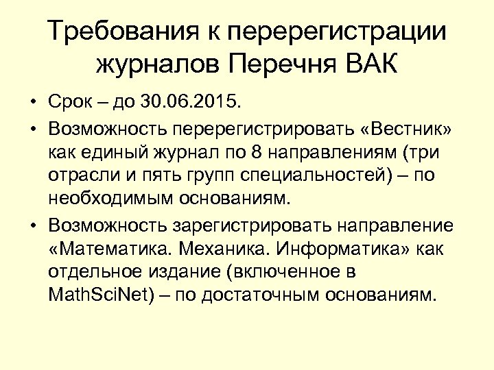 Требования к перерегистрации журналов Перечня ВАК • Срок – до 30. 06. 2015. • Возможность перерегистрировать «Вестник» как единый журнал по 8 направлениям (три отрасли и пять групп специальностей) – по необходимым основаниям. • Возможность зарегистрировать направление «Математика. Механика. Информатика» как отдельное издание (включенное в Math. Sci. Net) – по достаточным основаниям.