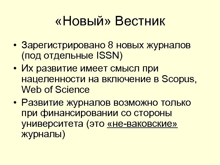 «Новый» Вестник • Зарегистрировано 8 новых журналов (под отдельные ISSN) • Их развитие имеет смысл при нацеленности на включение в Scopus, Web of Science • Развитие журналов возможно только при финансировании со стороны университета (это «не-ваковские» журналы)