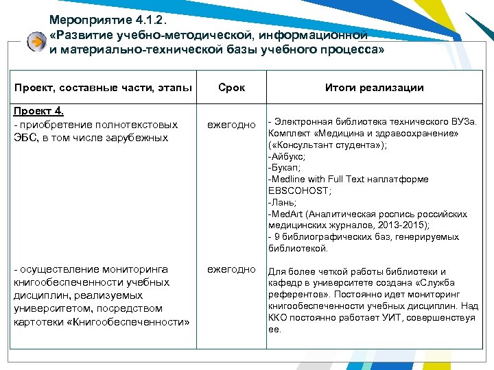 Мероприятие 4. 1. 2. «Развитие учебно-методической, информационной и материально-технической базы учебного процесса» Проект, составные части, этапы Проект 4. - приобретение полнотекстовых ЭБС, в том числе зарубежных - осуществление мониторинга книгообеспеченности учебных дисциплин, реализуемых университетом, посредством картотеки «Книгообеспеченности» Срок Итоги реализации ежегодно - Электронная библиотека технического ВУЗа. Комплект «Медицина и здравоохранение» ( «Консультант студента» ); -Айбукс; -Букап; -Medline with Full Text наплатформе EBSCOHOST; -Лань; -Med. Art (Аналитическая роспись российских медицинских журналов, 2013 -2015); - 9 библиографических баз, генерируемых библиотекой. Для более четкой работы библиотеки и кафедр в университете создана «Служба референтов» . Постоянно идет мониторинг книгообеспеченности учебных дисциплин. Над ККО постоянно работает УИТ, совершенствуя ее. ежегодно