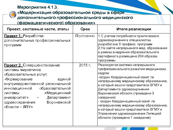 Мероприятие 4. 1. 3. «Модернизация образовательной среды в сфере дополнительного профессионального медицинского (фармацевтического) образования» Проект, составные части, этапы Проект 1. Разработка дополнительных профессиональных программ Проект 2. Совершенствование системы маркетинга образовательных услуг: -Формирование единой внутриведомственной региональной инновационной образовательной системы «Медицинский университет» – Департамент здравоохранения Воронежской области – ЛПУ» Срок Итоги реализации Постоянно 1. С учетом потребности практического 2015 г. здравоохранения в специалистах разработано 5 професс. программ 2. На сайте непрерывного мед. образования в рамках внедрения образовательного сертификата размещено 204 образов. программы Реализуется система непрерывного профессионального развития медицинских кадров: -создан Координационный совет по непрерывному медицинскому образованию, в который вошли представители ВГМУ и Департамента здравоохранения Воронежской области (проведено 3 заседания) - создан Координационный совет по непрерывному медицинскому образованию, в который вошли представители ВГМУ и Управления здравоохранения Липецкой области (проведено 1 заседание)