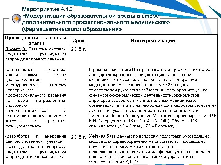 Мероприятие 4. 1. 3. «Модернизация образовательной среды в сфере дополнительного профессионального медицинского (фармацевтического) образования» Проект, составные части, Срок этапы Проект 3. Развитие системы 2015 г. Итоги реализации подготовки руководящих кадров для здравоохранения: -объединение подготовки управленческих кадров здравоохранения в многоуровневую систему непрерывного профессионального развития по всем направлениям, способную совершенствоваться и адаптироваться к условиям, в которых ей предстоит функционировать В рамках созданного Центра подготовки руководящих кадров для здравоохранения проведены циклы повышения квалификации «Эффективное управление ресурсами в медицинской организации» в объёме 72 часа для заместителей руководителей медицинских организаций по финансово-экономической деятельности, экономистов, диреторов субъектов и муниципальных медицинских организаций, а также лиц, находящихся в кадровом резерве на замещение указанных должностей для Воронежской и Липецкой областей (поручение Министра здравоохранения РФ В. И. Скворцовой от 18. 09. 2014 г. № 145). Обучено 118 специалистов (46 – Липецк, 72 – Воронеж). -разработка и внедрение 2015 г. Учётная база данных по вопросам подготовки руководящих централизованной учётной кадров для здравоохранения на слушателей, прошедших базы данных по вопросам обучение по программам дополнительного подготовки руководящих профессионального образования, формируется на кафедре кадров для здравоохранения общественного здоровья, экономики и управления в здравоохранении ИДПО