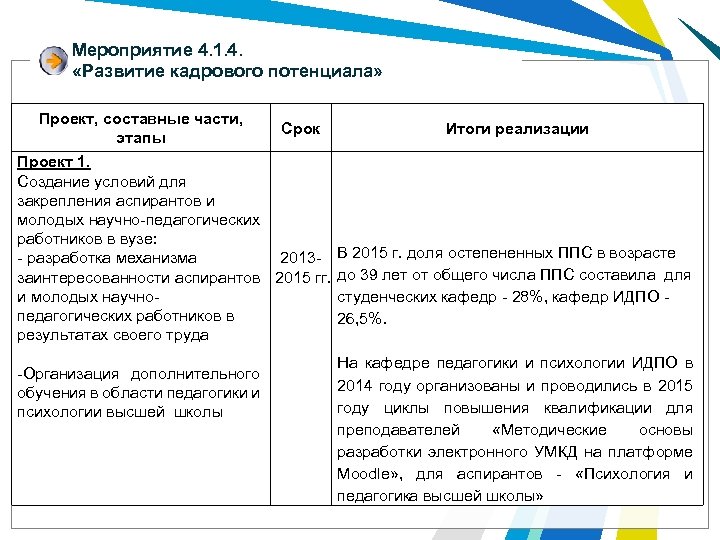 Мероприятие 4. 1. 4. «Развитие кадрового потенциала» Проект, составные части, этапы Срок Итоги реализации Проект 1. Создание условий для закрепления аспирантов и молодых научно-педагогических работников в вузе: - разработка механизма 2013 - В 2015 г. доля остепененных ППС в возрасте заинтересованности аспирантов 2015 гг. до 39 лет от общего числа ППС составила для и молодых научностуденческих кафедр - 28%, кафедр ИДПО - педагогических работников в 26, 5%. результатах своего труда -Организация дополнительного обучения в области педагогики и психологии высшей школы На кафедре педагогики и психологии ИДПО в 2014 году организованы и проводились в 2015 году циклы повышения квалификации для преподавателей «Методические основы разработки электронного УМКД на платформе Moodle» , для аспирантов - «Психология и педагогика высшей школы»