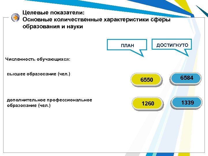 Целевые показатели: Основные количественные характеристики сферы образования и науки ДОСТИГНУТО ПЛАН Численность обучающихся: высшее образование (чел. ) 6550 дополнительное профессиональное образование (чел. ) 6584 1260 1339