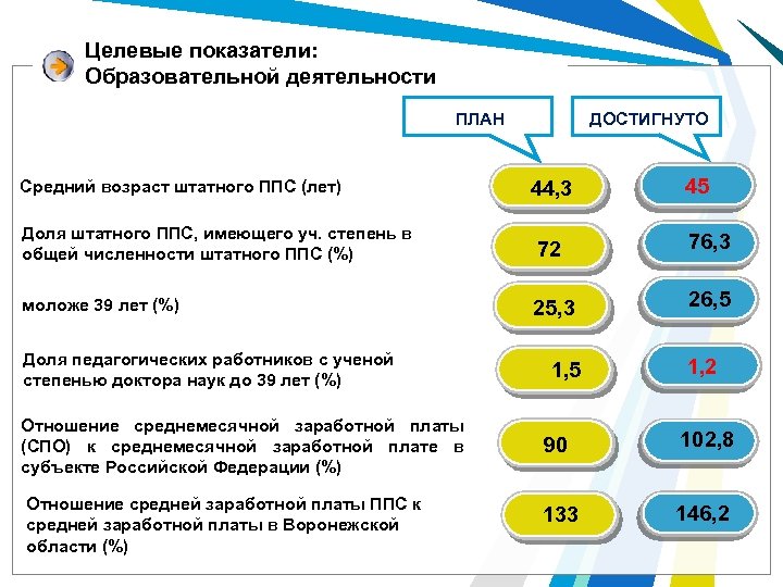 Целевые показатели: Образовательной деятельности ДОСТИГНУТО ПЛАН Средний возраст штатного ППС (лет) 44, 3 45 Доля штатного ППС, имеющего уч. степень в общей численности штатного ППС (%) 72 76, 3 моложе 39 лет (%) 25, 3 26, 5 Доля педагогических работников с ученой степенью доктора наук до 39 лет (%) Отношение среднемесячной заработной платы (СПО) к среднемесячной заработной плате в субъекте Российской Федерации (%) Отношение средней заработной платы ППС к средней заработной платы в Воронежской области (%) 1, 5 1, 2 90 102, 8 133 146, 2