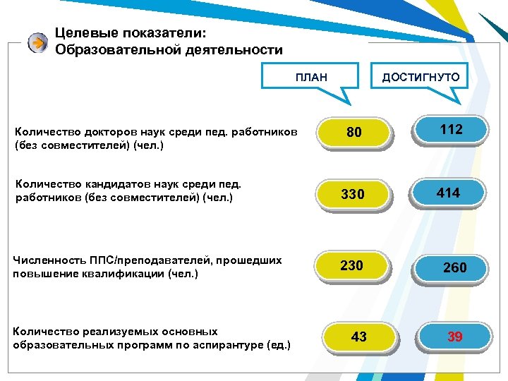 Целевые показатели: Образовательной деятельности ДОСТИГНУТО ПЛАН 80 112 Количество кандидатов наук среди пед. работников (без совместителей) (чел. ) 330 414 Численность ППС/преподавателей, прошедших повышение квалификации (чел. ) 230 260 43 39 Количество докторов наук среди пед. работников (без совместителей) (чел. ) Количество реализуемых основных образовательных программ по аспирантуре (ед. )