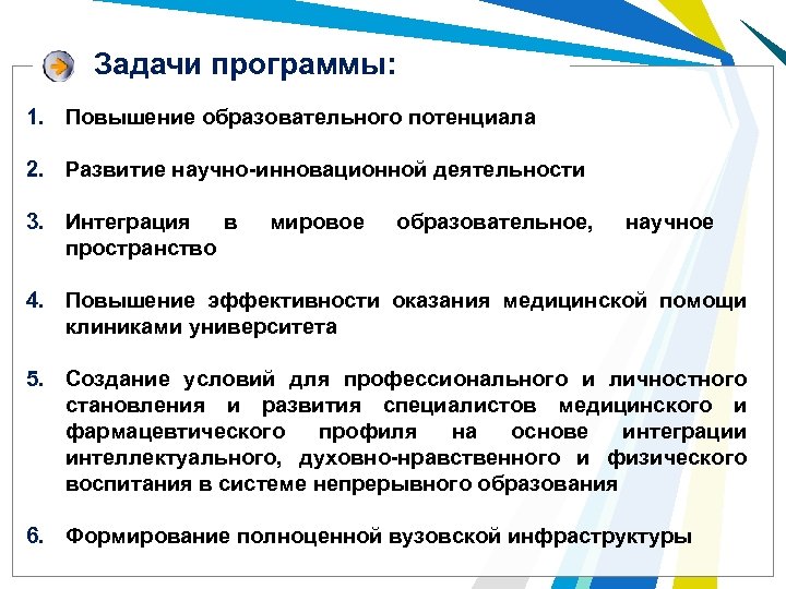 Задачи программы: 1. Повышение образовательного потенциала 2. Развитие научно-инновационной деятельности 3. Интеграция в пространство мировое образовательное, научное 4. Повышение эффективности оказания медицинской помощи клиниками университета 5. Создание условий для профессионального и личностного становления и развития специалистов медицинского и фармацевтического профиля на основе интеграции интеллектуального, духовно-нравственного и физического воспитания в системе непрерывного образования 6. Формирование полноценной вузовской инфраструктуры