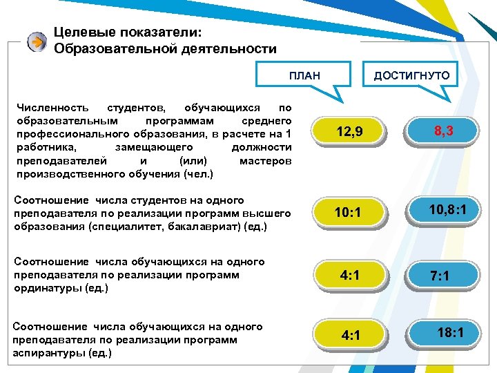 Целевые показатели: Образовательной деятельности ДОСТИГНУТО ПЛАН Численность студентов, обучающихся по образовательным программам среднего профессионального образования, в расчете на 1 работника, замещающего должности преподавателей и (или) мастеров производственного обучения (чел. ) Соотношение числа студентов на одного преподавателя по реализации программ высшего образования (специалитет, бакалавриат) (ед. ) 12, 9 10: 1 Соотношение числа обучающихся на одного преподавателя по реализации программ ординатуры (ед. ) 4: 1 Соотношение числа обучающихся на одного преподавателя по реализации программ аспирантуры (ед. ) 4: 1 8, 3 10, 8: 1 7: 1 18: 1