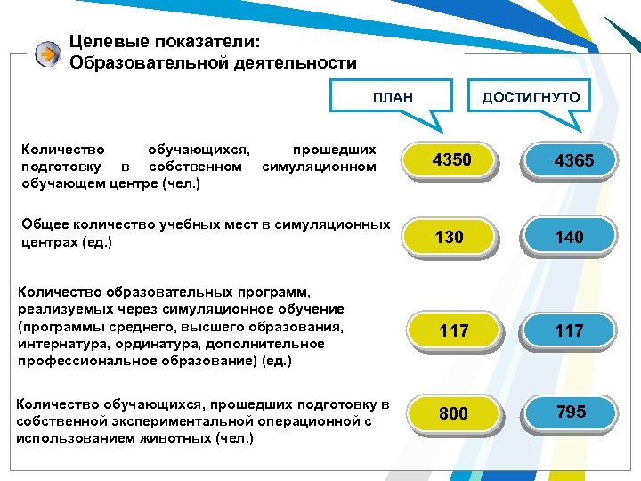Целевые показатели: Образовательной деятельности ДОСТИГНУТО ПЛАН Количество обучающихся, прошедших подготовку в собственном симуляционном обучающем центре (чел. ) 4350 4365 Общее количество учебных мест в симуляционных центрах (ед. ) 130 140 117 800 795 Количество образовательных программ, реализуемых через симуляционное обучение (программы среднего, высшего образования, интернатура, ординатура, дополнительное профессиональное образование) (ед. ) Количество обучающихся, прошедших подготовку в собственной экспериментальной операционной с использованием животных (чел. )