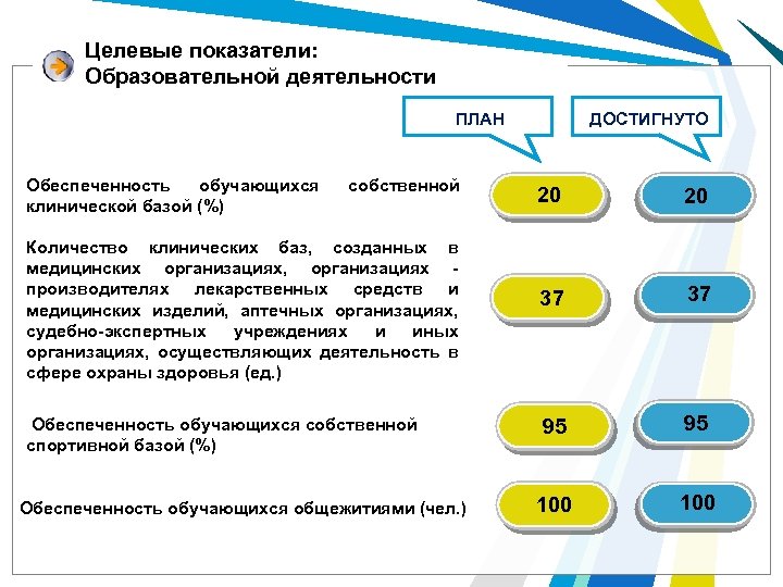 Целевые показатели: Образовательной деятельности ДОСТИГНУТО ПЛАН Обеспеченность обучающихся клинической базой (%) собственной Количество клинических баз, созданных в медицинских организациях, организациях - производителях лекарственных средств и медицинских изделий, аптечных организациях, судебно-экспертных учреждениях и иных организациях, осуществляющих деятельность в сфере охраны здоровья (ед. ) Обеспеченность обучающихся собственной спортивной базой (%) Обеспеченность обучающихся общежитиями (чел. ) 20 20 37 37 95 95 100