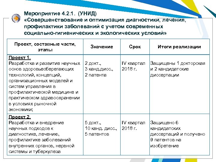 Мероприятие 4. 2. 1. (УНИД) «Совершенствование и оптимизация диагностики, лечения, профилактики заболеваний с учетом современных социально-гигиенических и экологических условий» Проект, составные части, этапы Значение Проект 1. Разработка и развитие научных 2 докт. , основ здоровьесберегающих 3 канд. дисс. , технологий, концепций, 2 патента организационных моделей и систем управления в профилактической медицине и практическом здравоохранении в условиях рыночной экономики; Проект 2. Разработка и внедрение научных подходов к диагностике, лечению, профилактике заболеваний внутренних органов, нервной системы и туберкулеза Срок Итоги реализации IV квартал Защищены 1 докторская 2018 г. и 2 кандидатские диссертации 5 докт. , IV квартал Защищено 6 10 канд. дисс. , 2018 г. кандидатских 5 патентов диссертаций и получено 9 патентов на изобретение