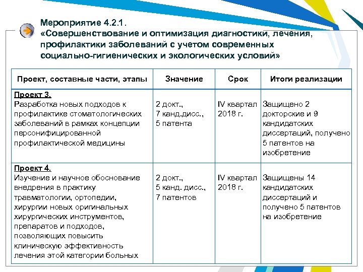 Мероприятие 4. 2. 1. «Совершенствование и оптимизация диагностики, лечения, профилактики заболеваний с учетом современных социально-гигиенических и экологических условий» Проект, составные части, этапы Проект 3. Разработка новых подходов к профилактике стоматологических заболеваний в рамках концепции персонифицированной профилактической медицины Проект 4. Изучение и научное обоснование внедрения в практику травматологии, ортопедии, хирургии новых оригинальных хирургических инструментов, препаратов и подходов, позволяющих повысить клиническую эффективность лечения этой категории больных Значение Срок Итоги реализации 2 докт. , 7 канд. дисс. , 5 патента IV квартал Защищено 2 2018 г. докторские и 9 кандидатских диссертаций, получено 5 патентов на изобретение 2 докт. , 5 канд. дисс. , 7 патентов IV квартал Защищены 14 2018 г. кандидатских диссертаций и получено 5 патентов на изобретение