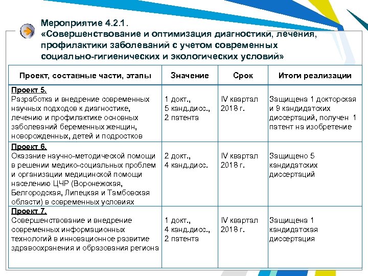 Мероприятие 4. 2. 1. «Совершенствование и оптимизация диагностики, лечения, профилактики заболеваний с учетом современных социально-гигиенических и экологических условий» Проект, составные части, этапы Проект 5. Разработка и внедрение современных научных подходов к диагностике, лечению и профилактике основных заболеваний беременных женщин, новорожденных, детей и подростков Проект 6. Оказание научно-методической помощи в решении медико-социальных проблем и организации медицинской помощи населению ЦЧР (Воронежская, Белгородская, Липецкая и Тамбовская области) в современных условиях Проект 7. Совершенствование и внедрение современных информационных технологий в инновационное развитие здравоохранения и образования региона Значение Срок Итоги реализации 1 докт. , 5 канд. дисс. , 2 патента IV квартал 2018 г. Защищена 1 докторская и 9 кандидатских диссертаций, получен 1 патент на изобретение 2 докт. , 4 канд. дисс. IV квартал 2018 г. Защищено 5 кандидатских диссертаций 1 докт. , 4 канд. дисс. , 2 патента IV квартал 2018 г. Защищена 1 кандидатская диссертация