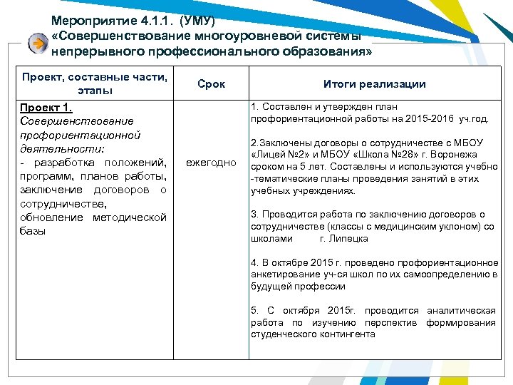 Мероприятие 4. 1. 1. (УМУ) «Совершенствование многоуровневой системы непрерывного профессионального образования» Проект, составные части, этапы Проект 1. Совершенствование профориентационной деятельности: - разработка положений, программ, планов работы, заключение договоров о сотрудничестве, обновление методической базы Срок Итоги реализации 1. Составлен и утвержден план профориентационной работы на 2015 -2016 уч. год. ежегодно 2. Заключены договоры о сотрудничестве с МБОУ «Лицей № 2» и МБОУ «Школа № 28» г. Воронежа сроком на 5 лет. Составлены и используются учебно -тематические планы проведения занятий в этих учебных учреждениях. 3. Проводится работа по заключению договоров о сотрудничестве (классы с медицинским уклоном) со школами г. Липецка 4. В октябре 2015 г. проведено профориентационное анкетирование уч-ся школ по их самоопределению в будущей профессии 5. С октября 2015 г. проводится аналитическая работа по изучению перспектив формирования студенческого контингента