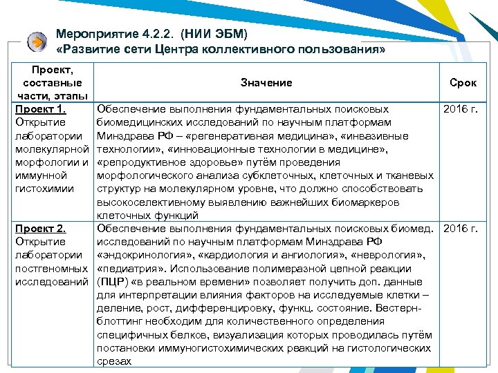 Мероприятие 4. 2. 2. (НИИ ЭБМ) «Развитие сети Центра коллективного пользования» Проект, составные части, этапы Проект 1. Открытие лаборатории молекулярной морфологии и иммунной гистохимии Значение Срок Обеспечение выполнения фундаментальных поисковых 2016 г. биомедицинских исследований по научным платформам Минздрава РФ – «регенеративная медицина» , «инвазивные технологии» , «инновационные технологии в медицине» , «репродуктивное здоровье» путём проведения морфологического анализа субклеточных, клеточных и тканевых структур на молекулярном уровне, что должно способствовать высокоселективному выявлению важнейших биомаркеров клеточных функций Проект 2. Обеспечение выполнения фундаментальных поисковых биомед. 2016 г. Открытие исследований по научным платформам Минздрава РФ лаборатории «эндокринология» , «кардиология и ангиология» , «неврология» , постгеномных «педиатрия» . Использование полимеразной цепной реакции исследований (ПЦР) «в реальном времени» позволяет получить доп. данные для интерпретации влияния факторов на исследуемые клетки – деление, рост, дифференцировку, функц. состояние. Вестернблоттинг необходим для количественного определения специфичных белков, визуализация которых проводилась путём постановки иммуногистохимических реакций на гистологических срезах