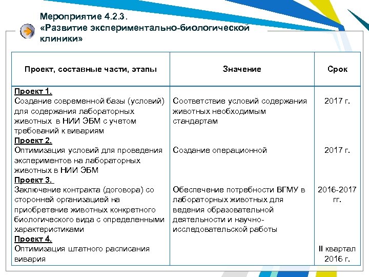 Мероприятие 4. 2. 3. «Развитие экспериментально-биологической клиники» Проект, составные части, этапы Проект 1. Создание современной базы (условий) для содержания лабораторных животных в НИИ ЭБМ с учетом требований к вивариям Проект 2. Оптимизация условий для проведения экспериментов на лабораторных животных в НИИ ЭБМ Проект 3. Заключение контракта (договора) со сторонней организацией на приобретение животных конкретного биологического вида с определенными характеристиками Проект 4. Оптимизация штатного расписания вивария Значение Срок Соответствие условий содержания животных необходимым стандартам 2017 г. Создание операционной 2017 г. Обеспечение потребности ВГМУ в лабораторных животных для ведения образовательной деятельности и научноисследовательской работы 2016 -2017 гг. II квартал 2016 г.