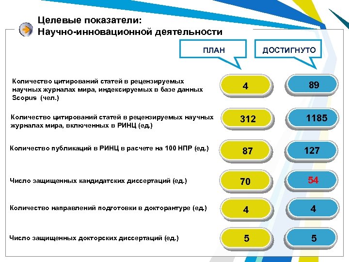 Целевые показатели: Научно-инновационной деятельности ДОСТИГНУТО ПЛАН Количество цитирований статей в рецензируемых научных журналах мира, индексируемых в базе данных Scopus (чел. ) 4 89 312 1185 87 127 70 54 Количество направлений подготовки в докторантуре (ед. ) 4 4 Число защищенных докторских диссертаций (ед. ) 5 5 Количество цитирований статей в рецензируемых научных журналах мира, включенных в РИНЦ (ед. ) Количество публикаций в РИНЦ в расчете на 100 НПР (ед. ) Число защищенных кандидатских диссертаций (ед. )