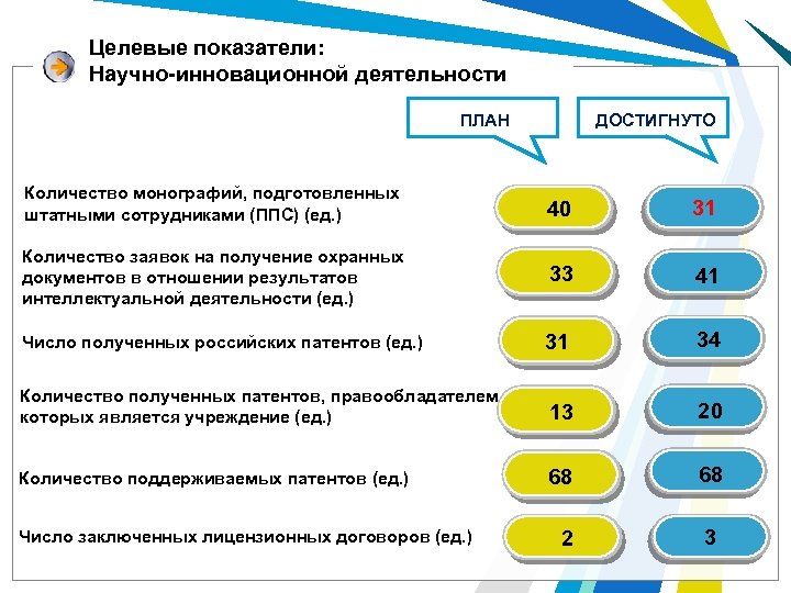 Целевые показатели: Научно-инновационной деятельности ДОСТИГНУТО ПЛАН Количество монографий, подготовленных штатными сотрудниками (ППС) (ед. ) 40 31 Количество заявок на получение охранных документов в отношении результатов интеллектуальной деятельности (ед. ) 33 41 Число полученных российских патентов (ед. ) 31 34 Количество полученных патентов, правообладателем которых является учреждение (ед. ) 13 20 Количество поддерживаемых патентов (ед. ) 68 2 3 Число заключенных лицензионных договоров (ед. )