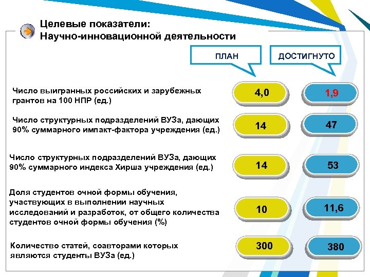 Целевые показатели: Научно-инновационной деятельности ДОСТИГНУТО ПЛАН Численность работников (НПР), выполняющих научные исследования и разработки (ед. ): 666 725 в том числе научных работников (ед. ) 7 5 имеющих индекс Хирша больше 1 (ед. ) 132 488 Удельный вес численности молодых учёных в общей численности НПР (ед. ) 35 12, 4 1 1 Число научных сотрудников, прошедших международные стажировки за рубежом (>1 мес) (чел. )
